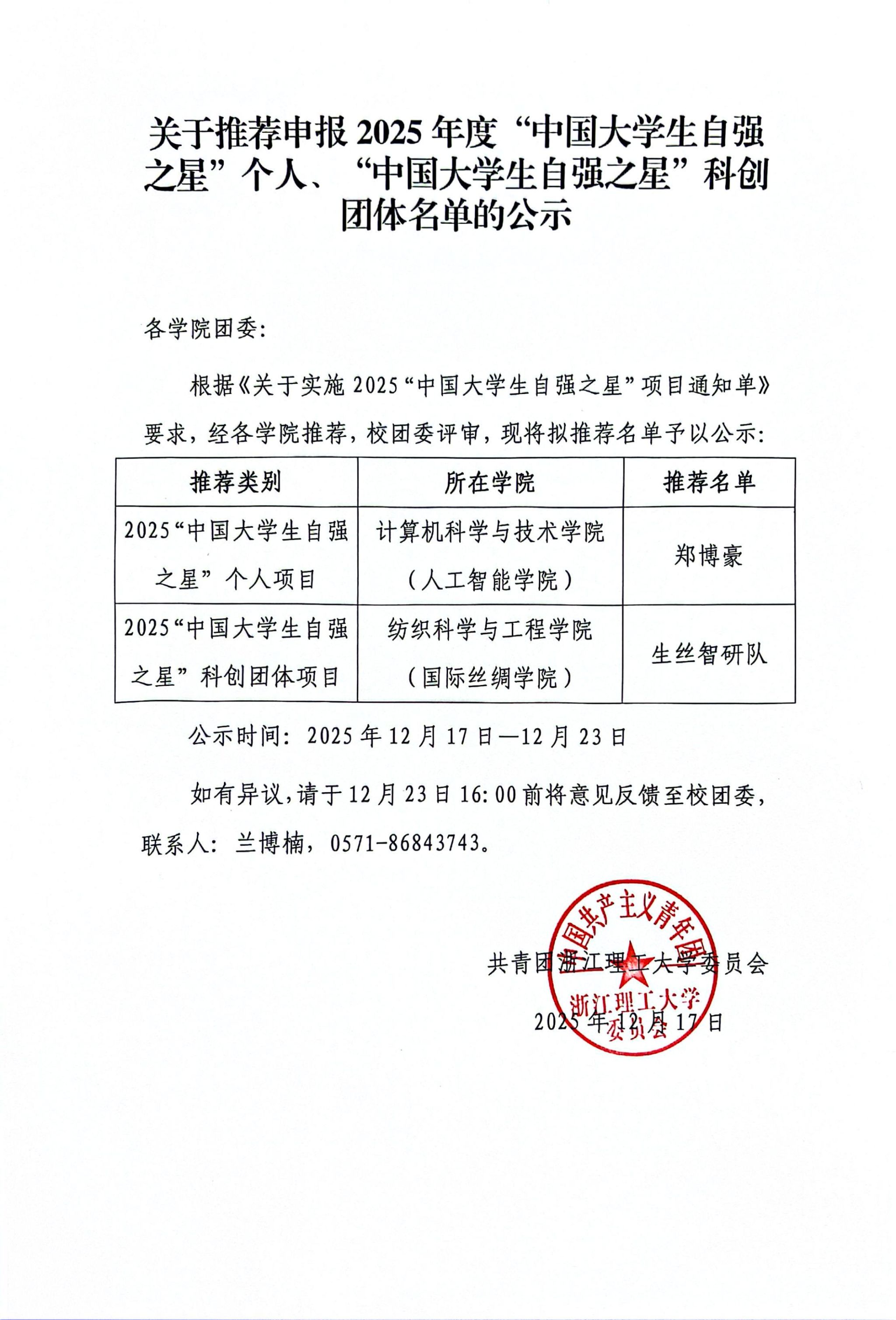 关于推荐申报2025年度“中国大学生自强之星”个人、“中国大学生自强之星”科创团体名单的公示