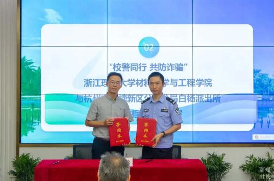 活动伊始,学院团委书记、学工办主任魏莉莉介绍了材料科学与工程学院和白杨派出所共同制定的防诈骗合作方案,介绍了学院成立的“大白杨警探分社”简况,接下来学院将配合白杨派出所通过视频、推送、班级宣讲等形式开展一系列防诈骗宣传教育活动;并在白杨派出所的帮助下,“大白杨警探分社”会派出成员,深入下沙部分企业、社区进行联动宣传,共同治理。随后,学院党委委员周照东代表学院与杭州市钱塘新区公安分局白杨派出所教导员沈建平签署合作框架协议,进一步明确了校警双方在防诈骗方面的合作内容。之后,白杨派出所教导员沈建平授予材料科学与工程学院“大白杨警探分社”称号,学院防诈骗宣传小分队队长林轩同学接牌。沈建平首先表示很荣幸参加此次活动。他指出,这次的“校警合作 共防诈骗”共建仪式可以使同学们深入了解防诈骗知识,减少身边的不安全因素,帮助同学们识破更多诈骗手段。同时希望同学们在活动中长久地坚持下去,建立长效机制,能够长期发挥校警合作的作用。鼓励同学们创新防诈骗知识的宣传模式,并逐步推广开来。