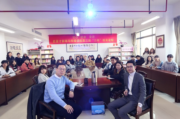 12月7日,史量才新闻传播学院在25号楼1519会议室举行以“新媒体 新生态——对话福布斯中国30岁以下精英”为主题的“三格”校友论坛,刚刚入选2019福布斯中国30岁以下精英的08级传播学校友冯宣植应邀而至,党总支副书记方平、学工办李驰跃热情接待冯宣植并主持论坛活动,学院各大学生组织干部、各班学生代表参加。