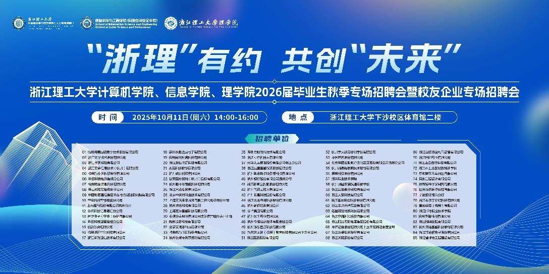 10月11日下午,由计算机学院、信息学院、理学院共同承办的“浙理有约 共创未来”浙江理工大学计算机学院、信息学院、理学院2026届毕业生秋季专场招聘会暨校友企业专场招聘会在下沙校区体育馆二楼成功举行。本次招聘会邀请了杭州海康威视数字技术股份有限公司、浙江大华技术股份有限公司、浙江宇视科技有限公司、恒生电子股份有限公司等近90家实力雄厚的用人单位,为学生倾心提供了近3000个就业岗位。活动现场热闹非凡,参与其中的学生达700余人。同学们以积极的心态和充分的准备主动递交简历,展现出对开启职业征程的强烈期待与憧憬。