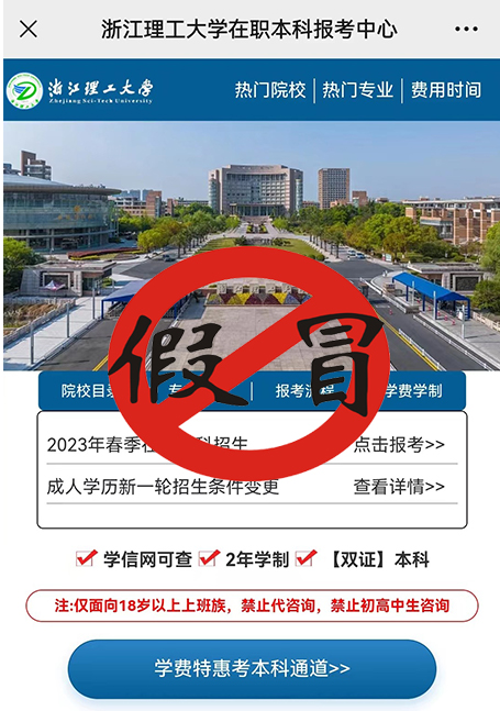 近期发现有校外机构和个人冒用“浙江理工大学”或“浙江理工大学继续教育学院”等名义,在网络媒体上散布虚假招生信息,误导学生、家长,严重损害了学校和学院的声誉,也损害了考生及家长的利益。为保障学校、学生权益不受侵犯,现就浙江理工大学继续教育招生工作声明如下: