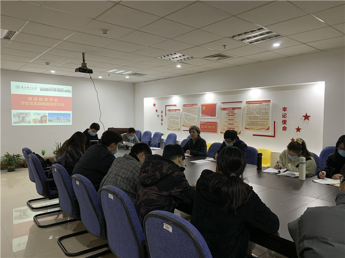 本次大会的主要内容为选举产生继续教育学院学生党支部书记、副书记。选举大会严格执行《中国共产党章程》、《中国共产党基层组织选举工作条例》的有关规定和程序,清点到会党员人数、院党总支书记龚素瓅讲话、听取和审议党支部工作报告、审议通过选举办法、介绍候选人名单、通过监票人和计票人名单、投票选举等环节。根据得票情况,最终郭超同志当选支部书记、王国书同志为支部副书记。