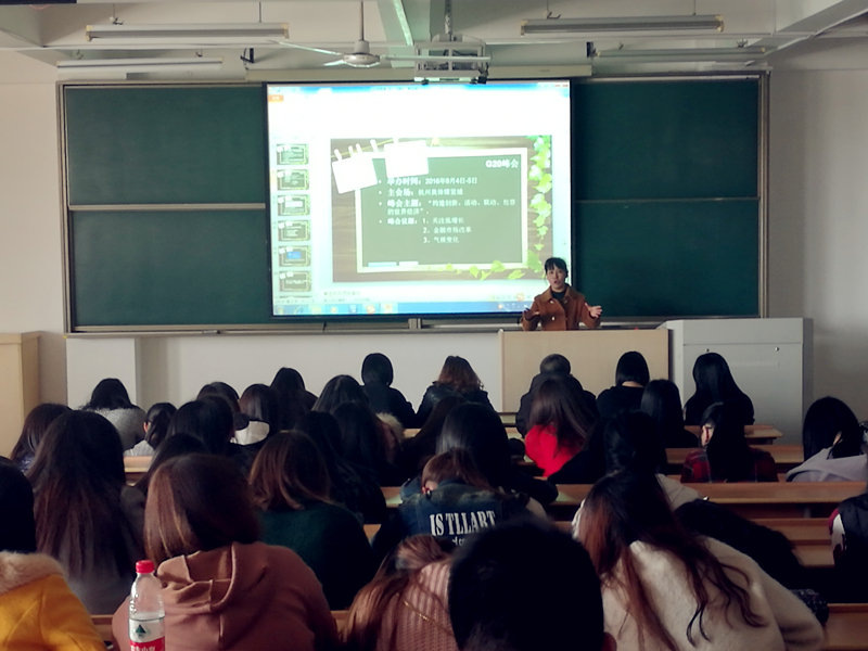 为迎接G20峰会在杭州顺利召开,展现在杭大学生风采,体现主人翁意识,我校于3月2日组织开展了“文明修身、迎G20峰会”主题班会。系主任、各班主任认真组织,全体同学积极参与,学生处相关人员到现场进行观摩。