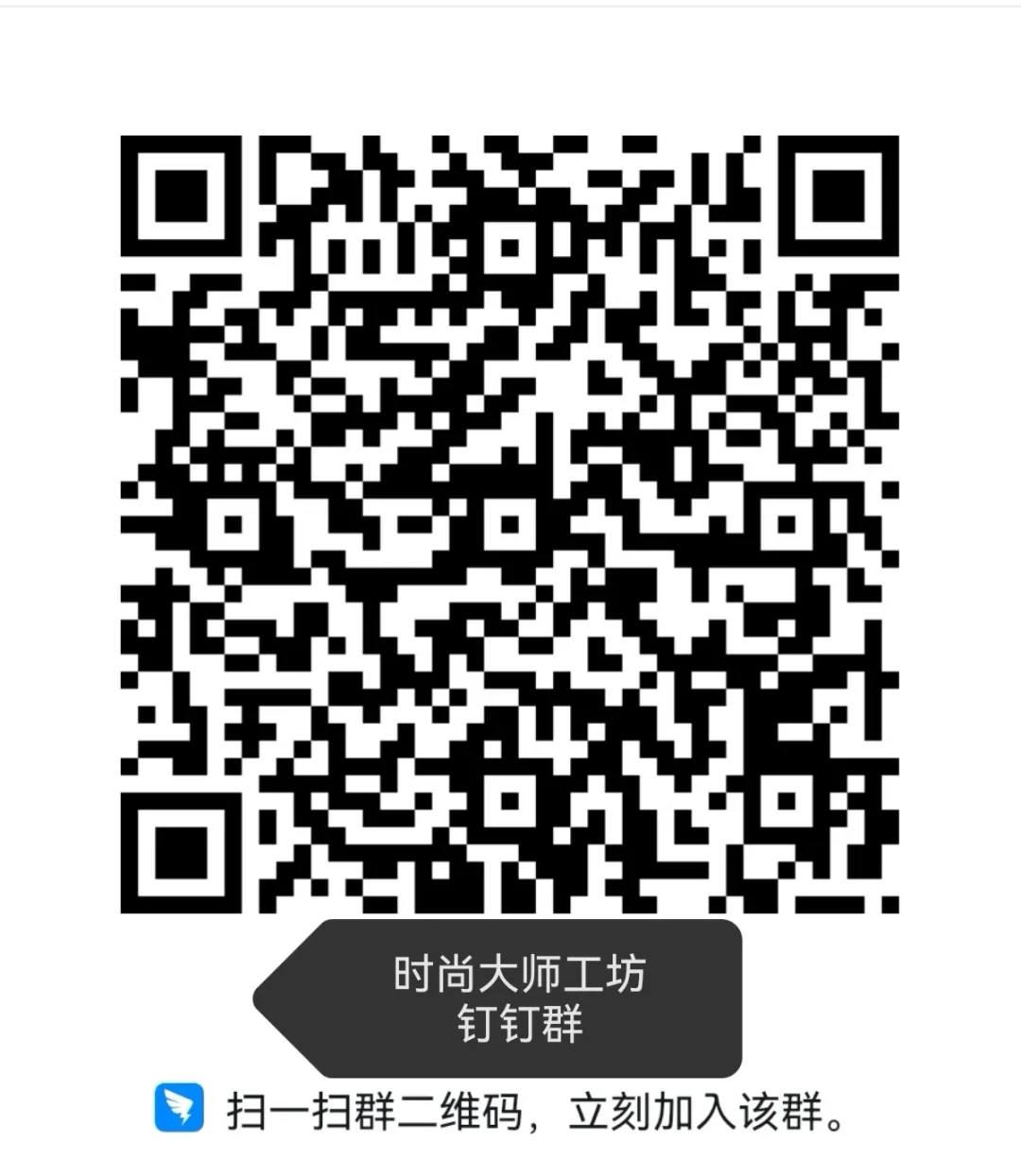 2.线上参加:为满足广大学员需求,本期时尚大师工坊讲座同步开设线上直播通道,有兴趣的学员可提前扫描下方二维码加入钉钉群,在线听取时尚大师讲座。
