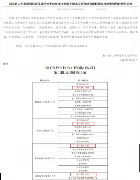 近日,浙江省人力资源和社会保障厅公布了浙江省数字技术工程师培育项目第三批培训机构目录,我校申报的数据安全工程、密码工程、智能制造工程、虚拟现实工程等四个职业的工程技术人员培育项目成功获批。自2023年获批第二批浙江省数字技术工程师培训机构以来,学校已经获得包括工业互联网工程技术人员在内的五个职业的工程技术人员培训机构资质。