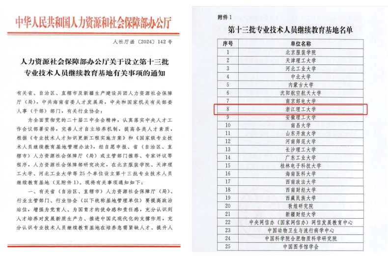 近日,人力资源社会保障部公布第十三批专业技术人员继续教育基地。浙江理工大学入选人社部第十三批专业技术人员继续教育基地。我校是浙江省本次唯一获批单位。