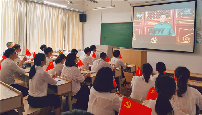 7月1日上午,学院(中心)组织全体教职工、党员以及学生入党积极分子代表集中收看“庆祝中国共产党成立100周年大会”实况直播,认真聆听总书记重要讲话,共庆建党一百周年,畅谈感悟,为党送上最诚挚的祝福。