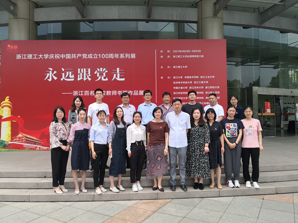为庆祝中国共产党成立100周年,着力推进党史学习教育,5月14日中午,我院教工党支部牵头组织学院教职工走进浙江理工大学丝绸博物馆,参观“永远跟党走”——浙江百名高校教师书画作品展,回顾党的光辉历程,讴歌党的伟大成就,传承党的奋斗精神。