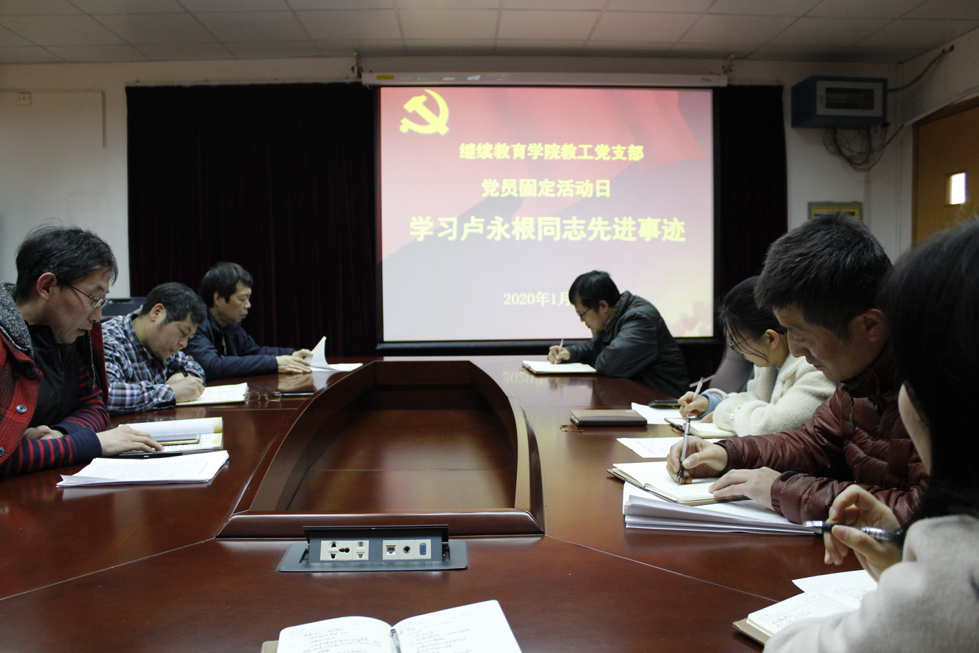 2020年1月8日下午,我院教工支部1月份党员固定日活动在文一校区301会议室举行,党员们通过视频集体学习了“时代楷模”卢永根同志的先进事迹,会议由教工支部书记高建明主持。