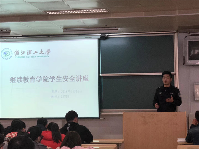 3月12日下午,我院邀请了白杨派出所三名警官在下沙校区2N319教室为学生作安全知识讲座,企业人才培养中心、技能培养中心和自学助考中心共100多名学生代表参加了讲座。