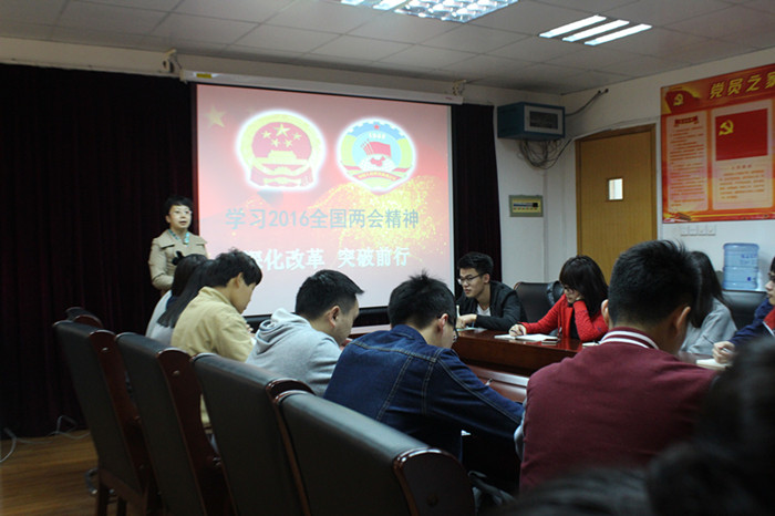 4月8日上午,我院学生党支部在学院“党员之家”召开了以“2016年全国两会精神”为主题的学习交流会,传达学习了十二届全国人大三次会议和全国政协十二届三次会议精神。党总支副书记章迪薇通过图文介绍,带领大家专题学习了前不久结束的全国两会的精神。