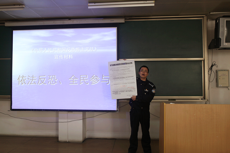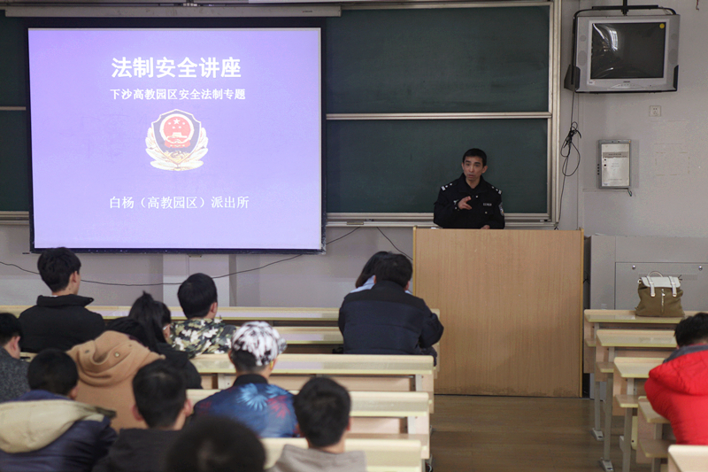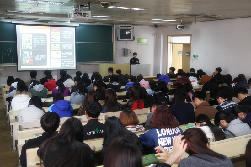 学生的安全是正常教育教学的保障,也是学生健康成长的前提,两位警官从学生实际出发,围绕盗窃、诈骗、消防、打架、网购、宿舍、交通等安全问题展开,并通过案例向同学们讲解了基本法律法规以及安全法制的重要性。针对G20峰会专题,派出所警官还向同学们讲解了如何开展防爆反恐,图文并茂,语言生动,受到同学们的欢迎。