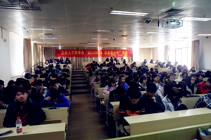 3月1日上午9:30,我院企业人才班组织开展了“迎G20峰会,法在我心中”为主题的安全法制讲座。讲座由白杨派出所黎警官、下沙派出所向警官等四位警官主讲,学生处相关人员、各系主任、班主任和全体大一学生参加。