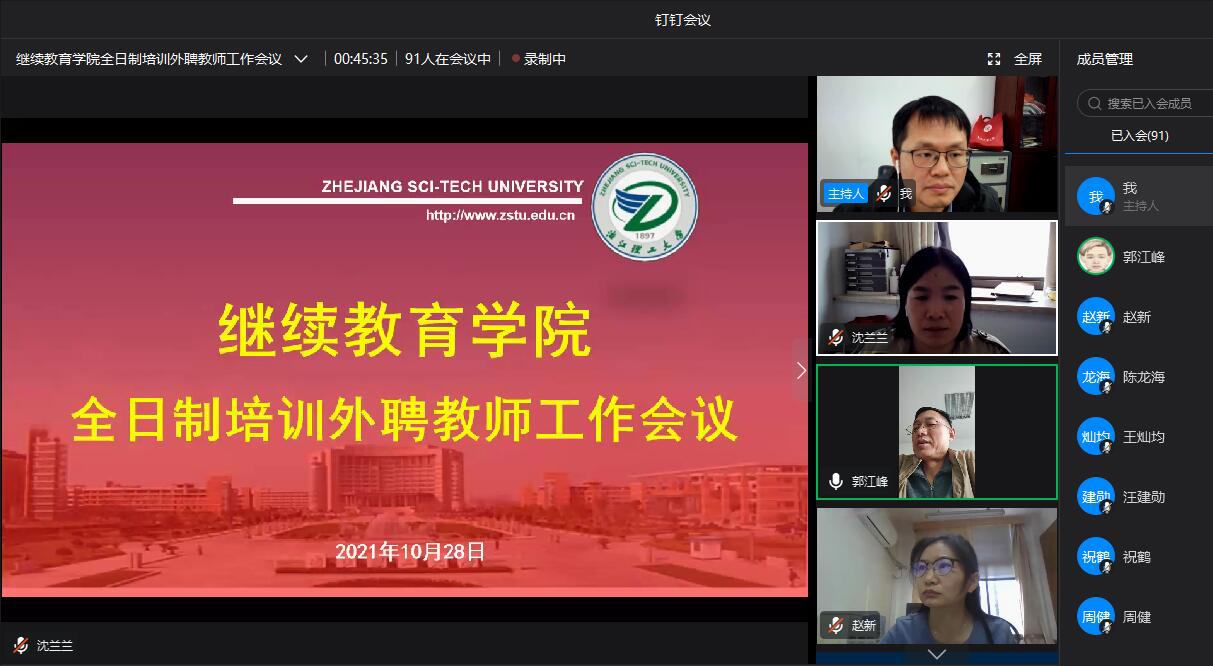 2021年10月28日中午,我院召开全日制培训外聘教师工作视频会议,梳理和总结外聘教师在日常教学方面存在的问题和不足,进一步明确了外聘教师在日常教育教学方面的职责和要求。会议由副院长赵新主持,学院郭江峰院长、相关科室负责人、各项目管理中心主要负责人和教务管理人员以及全体外聘教师参加会议。