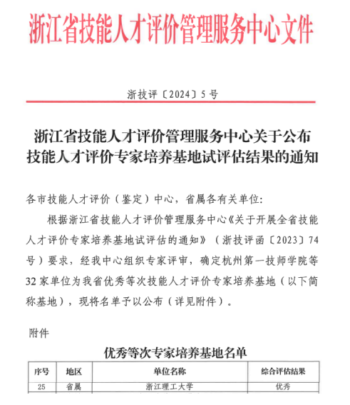 近日,浙江省技能人才评价管理服务中心公布了浙江省技能人才评价专家培养基地试评估结果,我校获浙江省优秀等次技能人才评价专家培养基地。