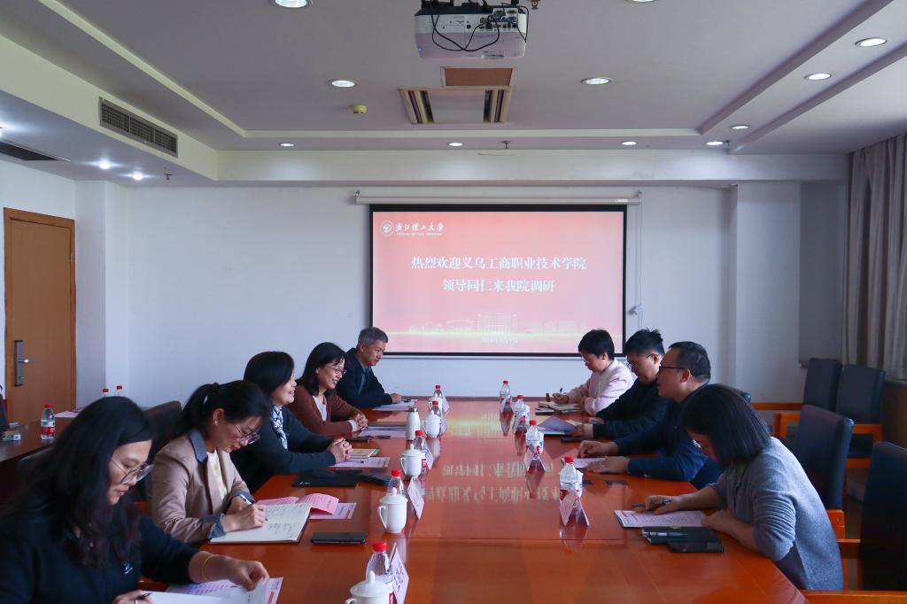 4月9日下午,义乌工商职业技术学院继续教育学院院长王一丁、创意设计学院党委书记陈庆一行来我院调研交流。学院院长龚素瓅、学院党委书记朱秋飞及相关人员参加交流活动。