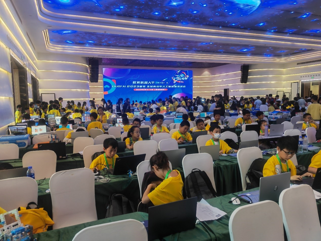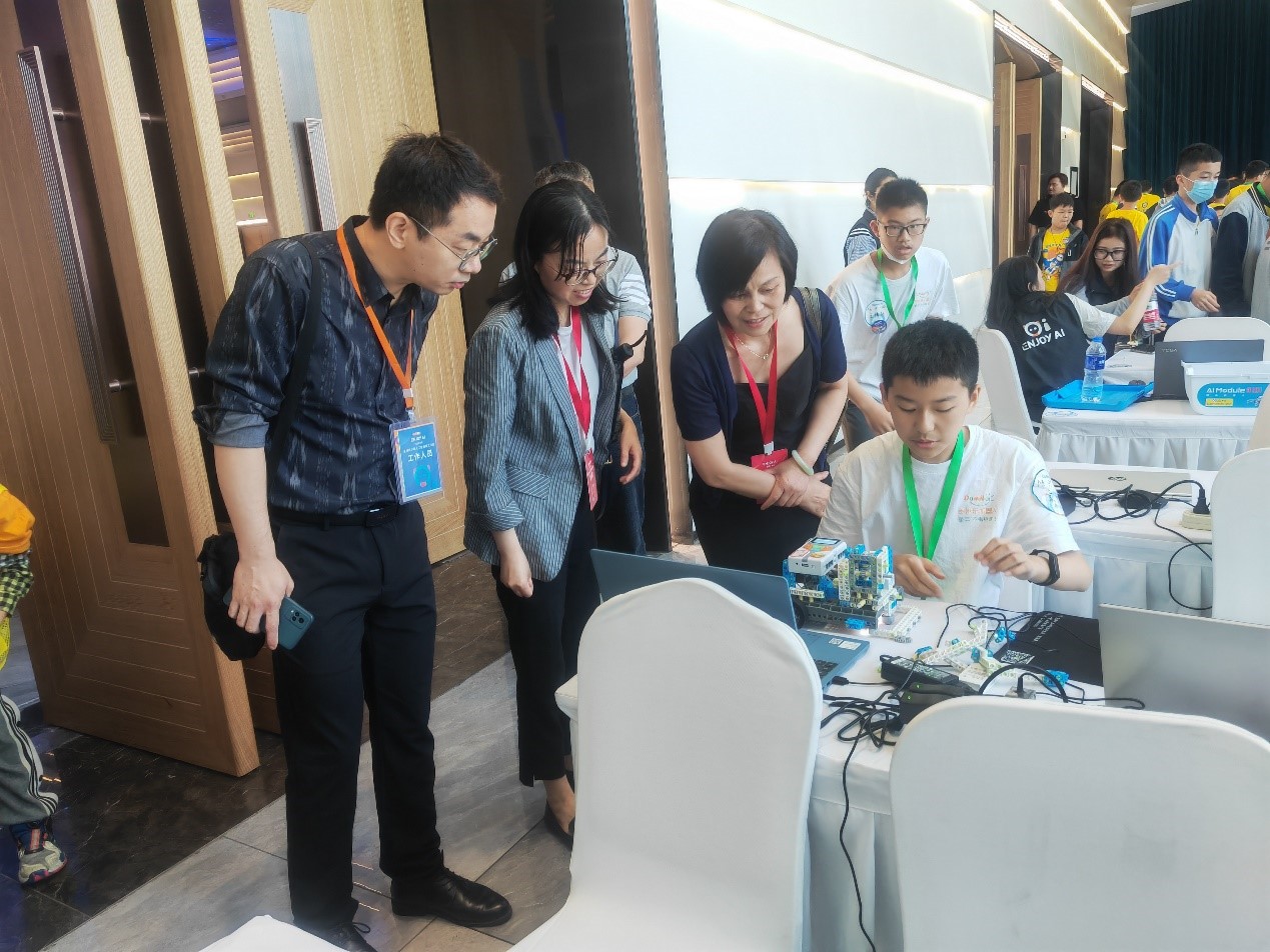 龚素瓅、许丽芬一行先参观了乌镇青少年科创研学基地。创始人兼董事长余文灏陪同。此次调研正值教育机器人节(嘉兴站)暨ENJOY AI 2023赛季(华东地区)在该基地举行,余文灏在比赛现场详细介绍了比赛安排与比赛项目的具体情况。龚素瓅、许丽芬在参观过程中与参赛学生进行了亲切的沟通交流。